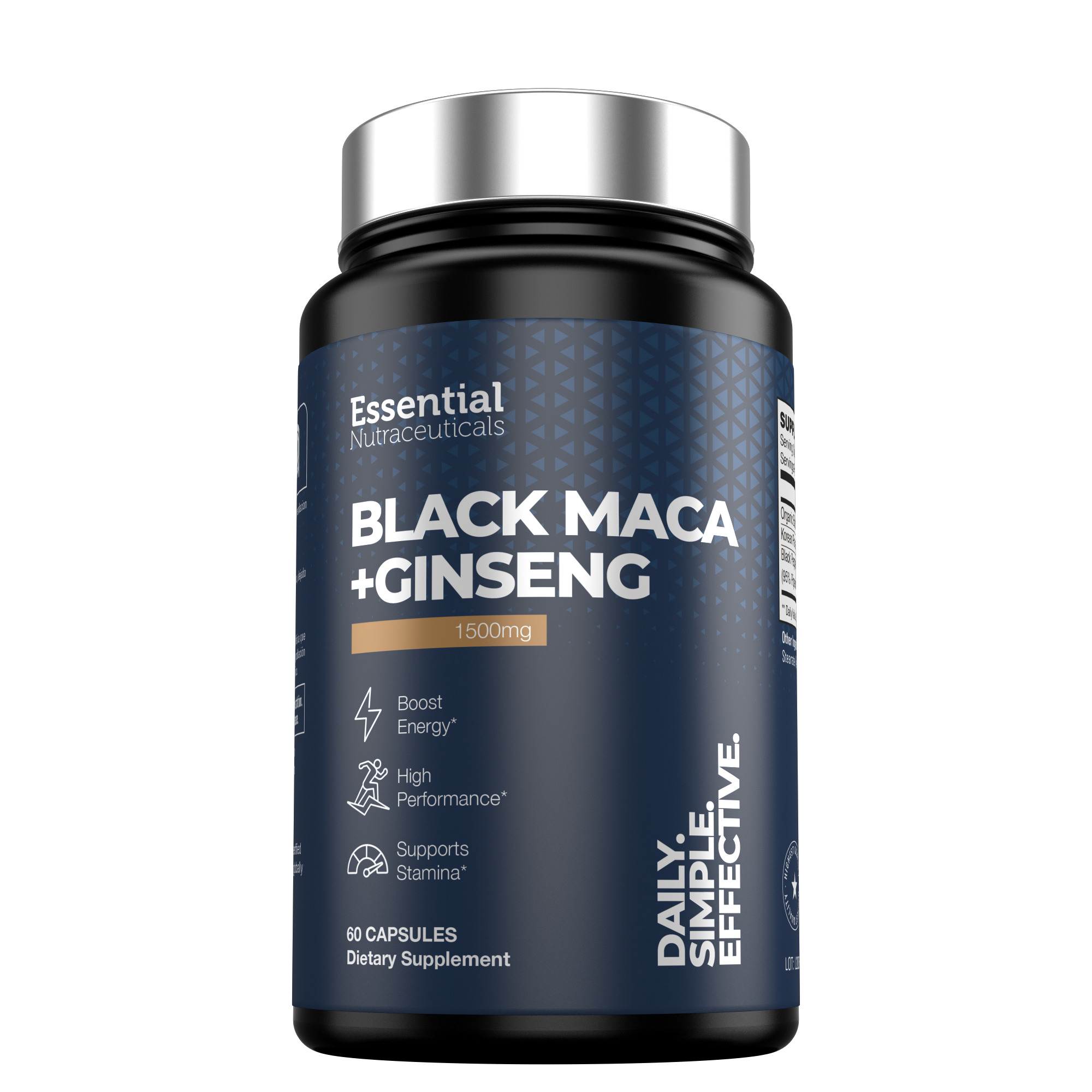 Detalles: 60 cápsulas · 1500 mg · Maca Negra + Ginseng · Marca: Essential Nutraceuticals Uso: 2 cápsulas al día con agua