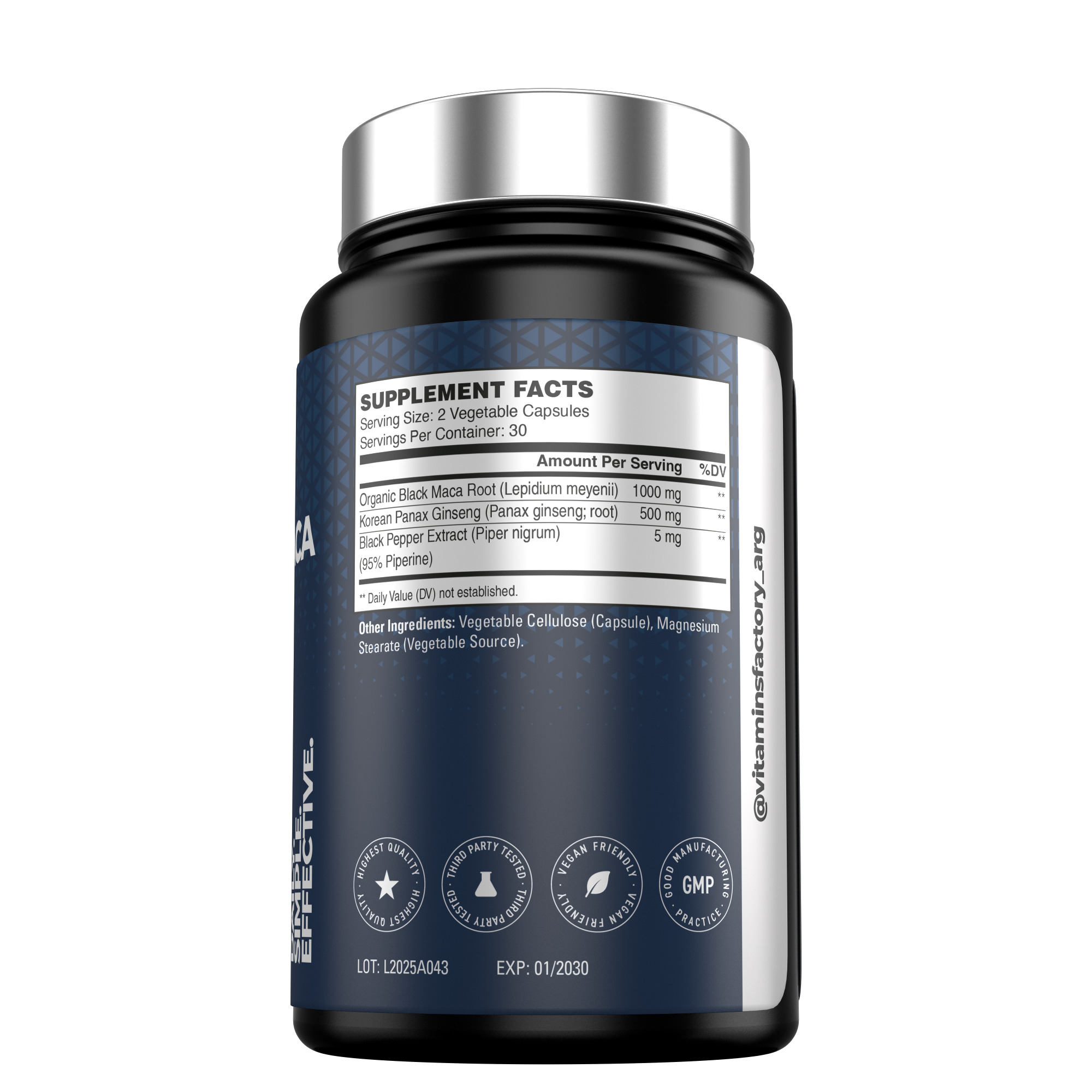 Black Maca + Ginseng es la combinación más poderosa para hombres que buscan llevar su energía y rendimiento al siguiente nivel. Maca Negra andina + Ginseng coreano en una sola fórmula de 1500 mg, para quienes no se conforman con menos.